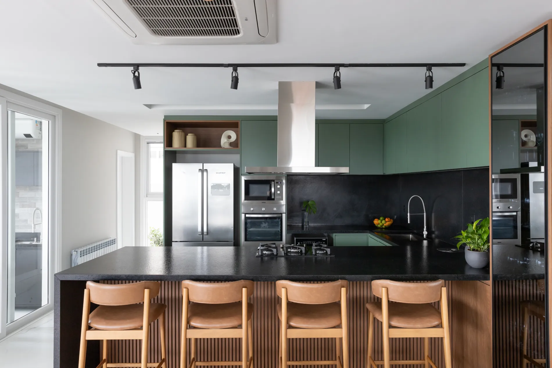 Seja na área social ou na área íntima, os ambientes internos conversam entre si no que diz respeito aos materiais e à paleta de cores, empregando personalidade ao conjunto.