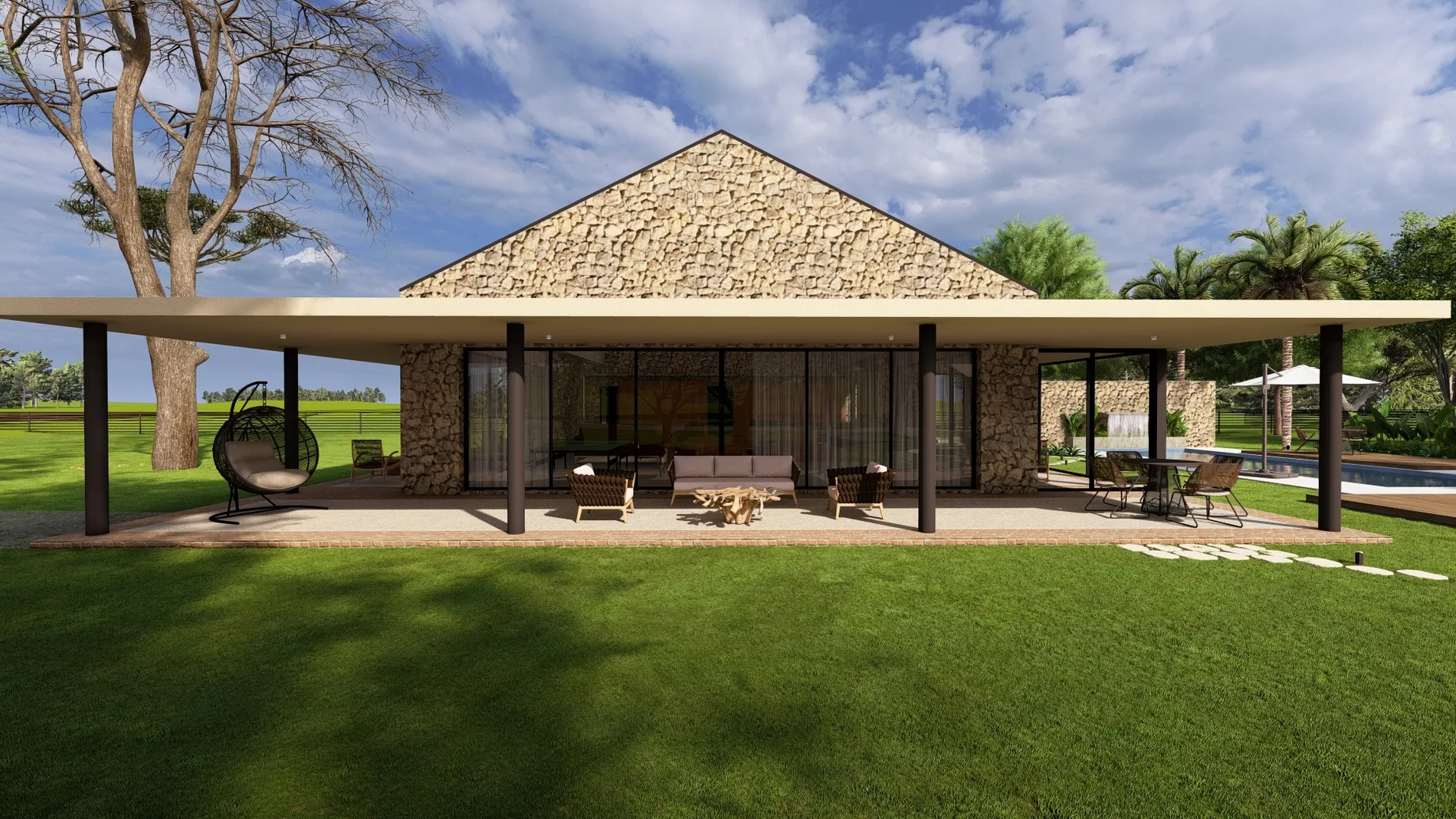 O programa se organiza em torno da integração: as áreas sociais se abrem generosamente para o entorno, conectando o interior ao jardim, ao lago e aos morros ao longe. Redes, hidro, piscina e um pit fire compõem os espaços de descompressão ao ar livre, enquanto o setor íntimo resguarda o silêncio e a contemplação.