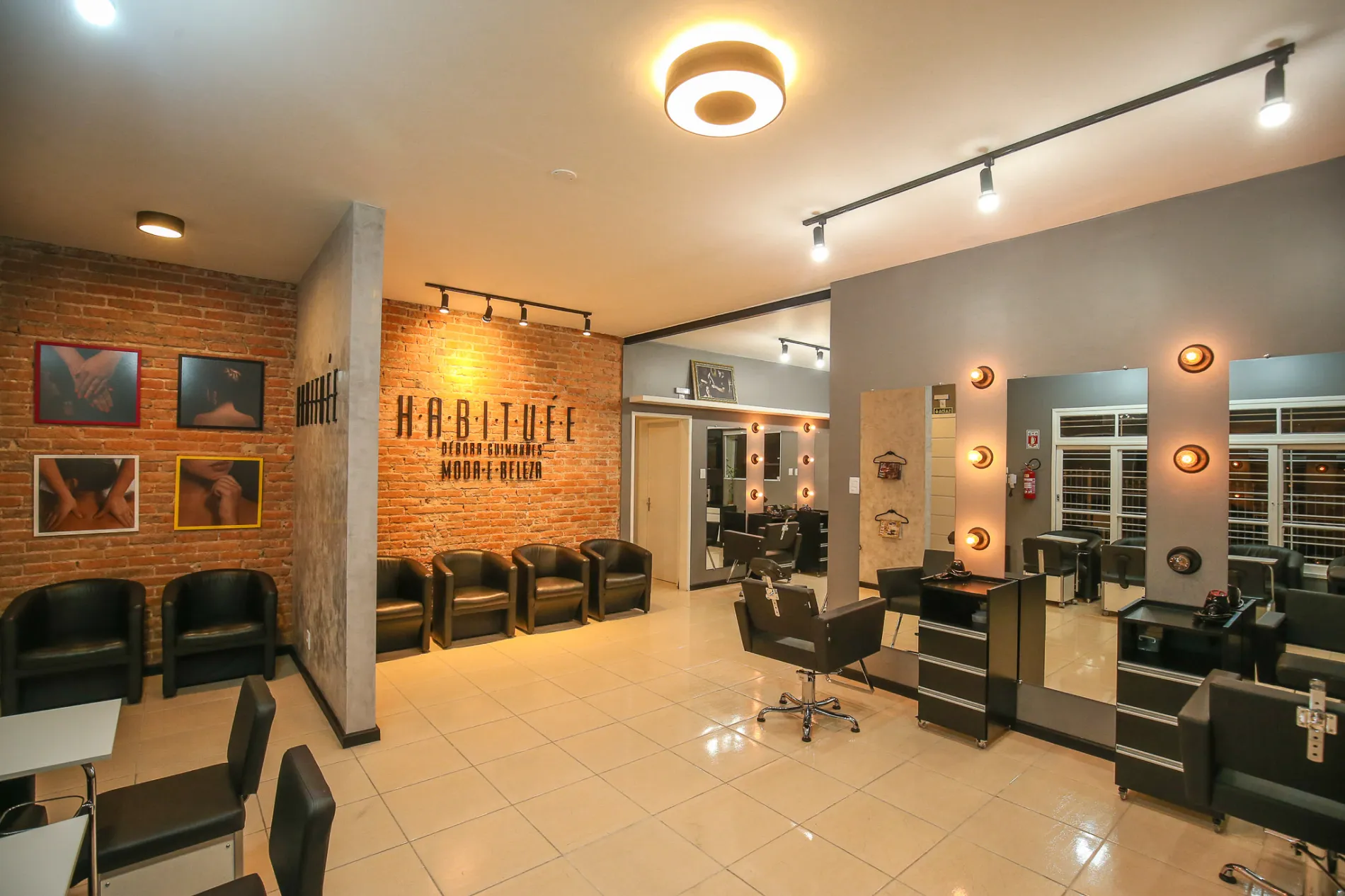 A Habituée Moda e Beleza, projetada no estilo clean, apresenta espaços que transmitem a linguagem visual de forma clara e sofisticada. Na sala de espera, a estrutura da edificação, que é de tijolo maciço, é utilizada como um elemento decorativo, e contrasta com a aplicação de concreto aparente.