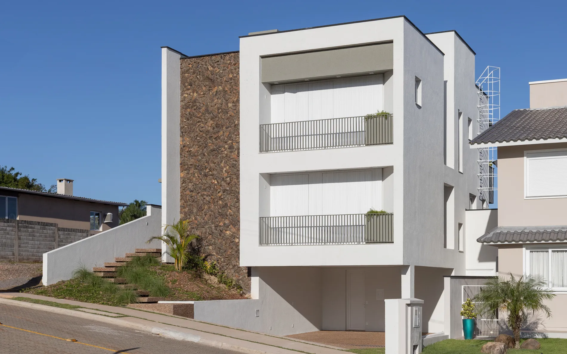 Os planos horizontais se projetam sobre o terreno com precisão e leveza, desenhando varandas, marquises e vãos generosos que dissolvem os limites entre dentro e fora. A madeira ripada aquece os volumes e confere ritmo às fachadas, enquanto os grandes panos de vidro revelam os interiores com naturalidade — um espaço onde o viver acontece com fluidez e conexão.