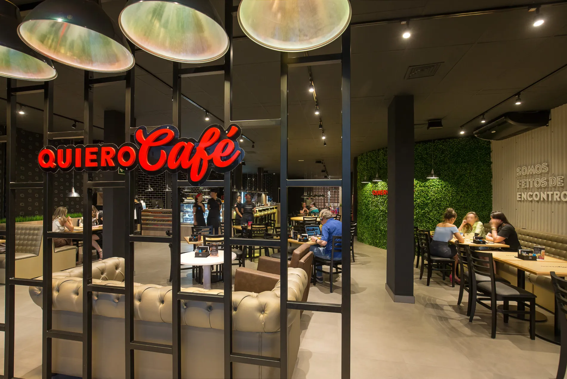 O projeto do Quiero Café se apoia em uma linguagem arquitetônica acolhedora e contemporânea, marcada pelo contraste entre materiais naturais e industriais. O uso predominante do preto nas paredes e teto confere unidade visual ao ambiente, enquanto o mobiliário em madeira clara e as luminárias metálicas pendentes criam pontos de aconchego e ritmo.
