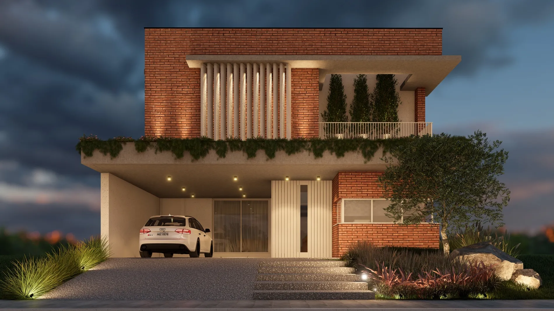 O uso criterioso dos materiais — concreto aparente, tijolos maciços e brises metálicos — dialoga com a vegetação e com a iluminação natural, promovendo conforto térmico e visual. A presença de vegetação suspensa e o paisagismo frontal complementam a proposta de uma morada urbana com alma natural.