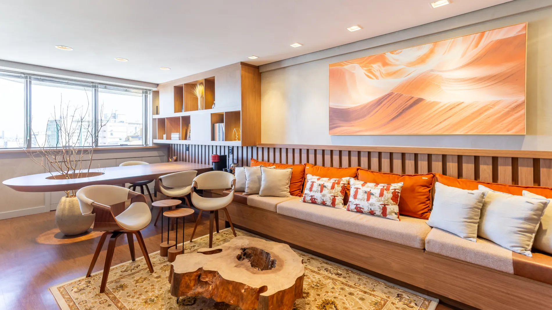O projeto do escritório Mowa em Porto Alegre valoriza a integração entre materiais naturais, luz e conforto. O mobiliário sob medida em madeira e a paginação do painel ripado criam unidade visual, enquanto elementos como a lareira em mármore e a mesa com base escultórica reforçam o cuidado com os detalhes. A arquitetura busca expressar elegância discreta e coerência espacial, aliando funcionalidade a uma atmosfera serena e contemporânea.